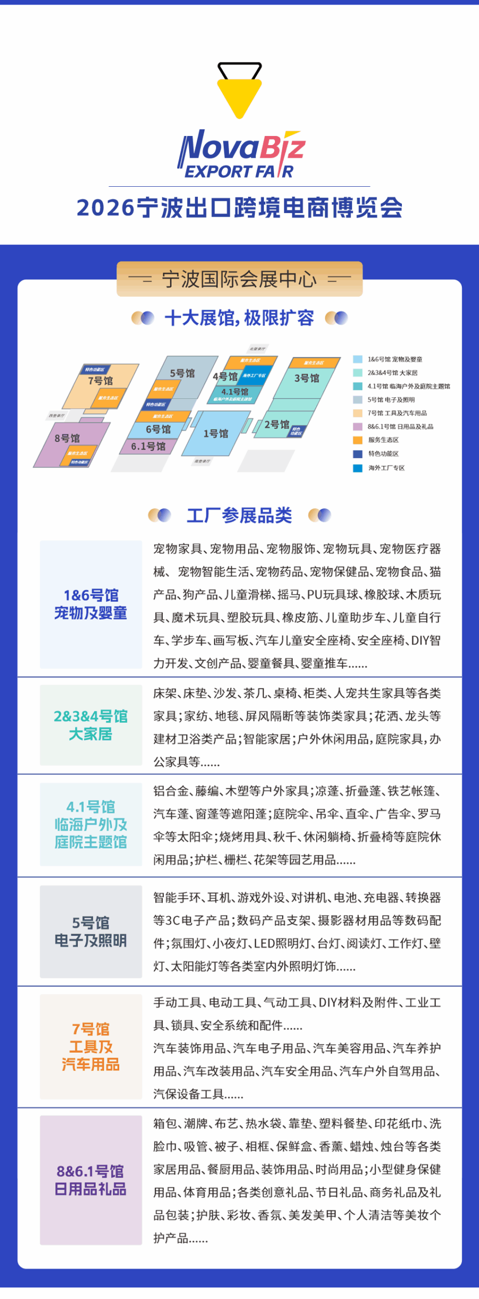 “宁波馆+余姚馆”十三馆齐开 宁波跨博会是目前国内最具号召力的跨境高端专业展之一,也是国内唯一以“大家居”为核心品类的展会。2026年展会全新升级,以“一展双呈”的方式成就中国跨境电商规模第一展,也将打造跨境电商展会的一展两地“首创”。